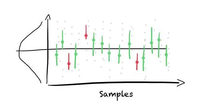 上图展示了从正态分布中抽取不同样本并计算90%置信区间的情况。红色列表示不包含总体均值的置信区间。