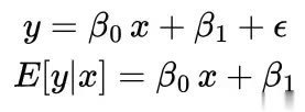 其中:y 代表目标变量E[x|y] 代表条件期望响应x 代表特征变量beta_0 代表斜率系数beta_1 代表截距系数epsilon 代表随机误差项